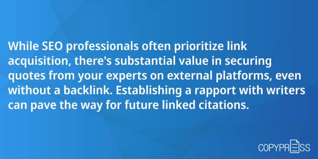 While SEO professionals often prioritize link acquisition, there’s substantial value in securing quotes from your experts on external platforms — even without a backlink. Establishing a rapport with writers can pave the way for future linked citations.