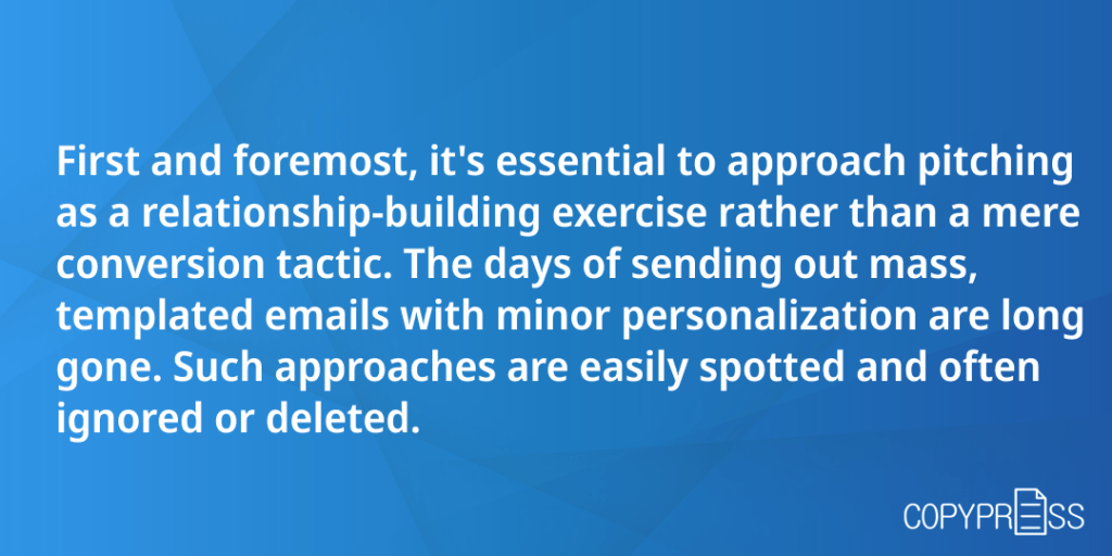 First and foremost, it’s essential to approach pitching as a relationship-building exercise rather than a mere conversion tactic. The days of sending out mass, templated emails with minor personalization are long gone. Such approaches are easily spotted and often ignored or deleted.