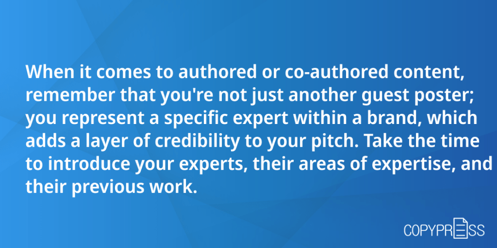 When it comes to authored or co-authored content, remember that you’re not just another guest poster. You represent a specific expert within a brand, which adds a layer of credibility to your pitch. So, take the time to introduce your experts, their areas of expertise, and their previous work. Offer potential topics but also stay open to topics the publisher suggests.